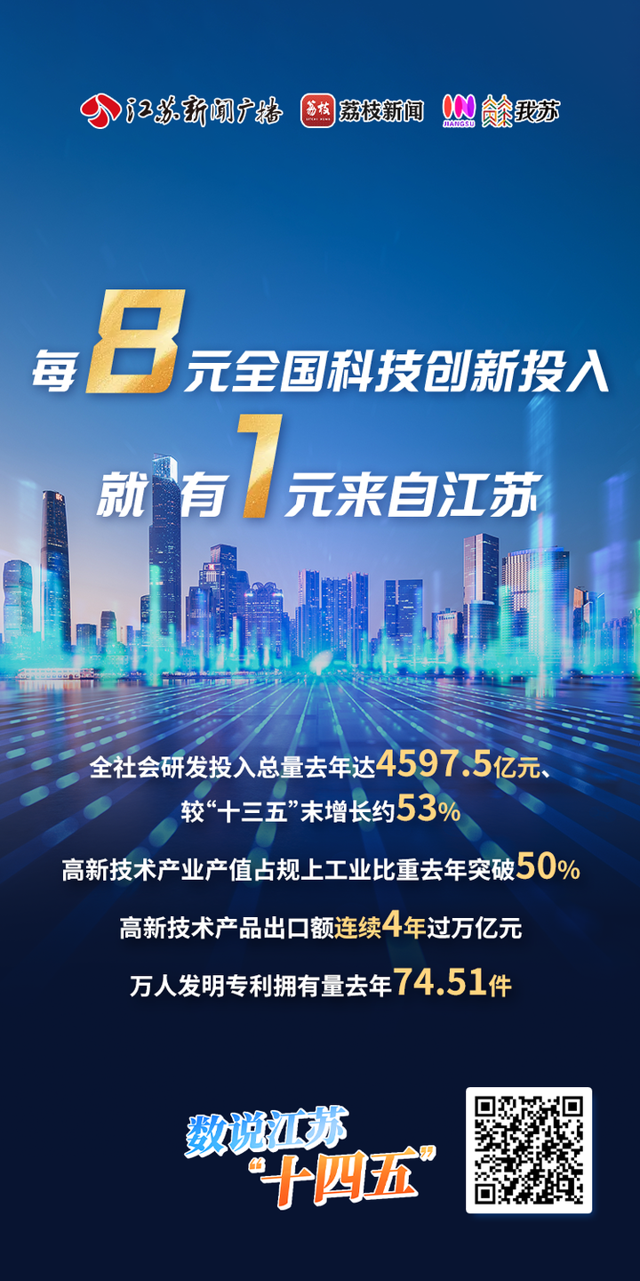 今天(12月16日),江苏省政府新闻办举行“高质量完成‘十四五’规划”系列主题第二场新闻发布会,现场发布了一份沉甸甸的“创新答卷”。“十四五”期间,江苏全社会研发投入总量去年达4597.5亿元、较“十三五”末增长约53%。相当于在全国科技创新上每投入8元钱,就有1元来自江苏。