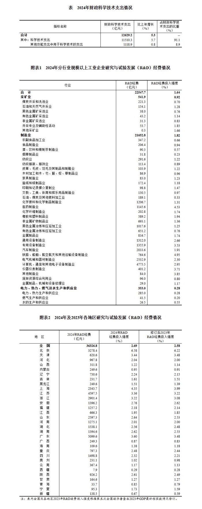 2024年,全国研究与试验发展(R&D)经费投入保持稳定增长,投入强度较快提升,基础研究投入取得新突破,国家财政科技支出稳步增加。