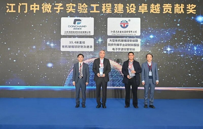 会上,83座晶莹剔透的有机玻璃奖杯格外引人注目,它们分别颁发给为项目作出卓越和突出贡献的全国科技企业。而这些奖杯的特殊之处在于和中微子实验装置核心载体有机玻璃球材质一致,都由江苏汤臣新材料科技有限公司制作。刚领到卓越贡献奖的汤臣新材料公司董事长汤月生,小心翼翼地将奖杯安放妥当,才接通了记者的电话。“能为国家重器添砖加瓦,这份荣誉比什么都珍贵。”电话那头,他的声音里满是自豪。