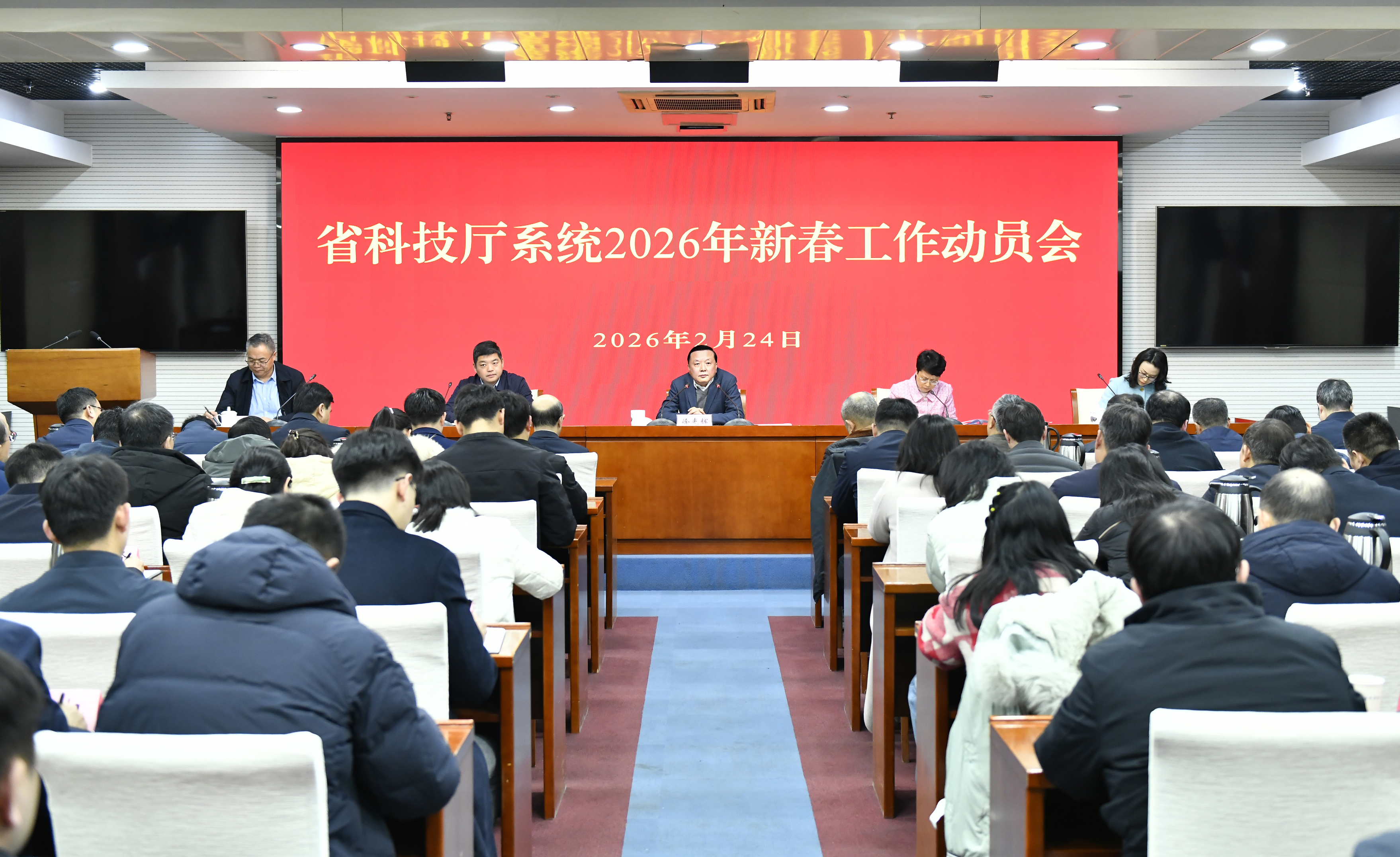 2月24日,省科技厅召开2026年新春工作动员会,击鼓催征、勇挑大梁,奋进“十五五”、建功新征程,为高水平建设科技强省贡献力量。厅党组书记、厅长徐光辉出席会议并讲话,副厅长倪菡忆主持会议,副厅长蔡英凤通报厅系统受有关表彰情况,厅机关干部代表徐浩、郦雅芳、刘杰、张竞博作交流发言。