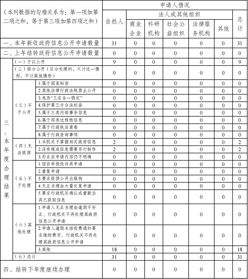 严格按照政府信息依申请公开办理流程,全年共受理依申请公开来件31件,全部为自然人申请,均在规定时间内办结,其中予以公开答复9件、申请人撤销申请18件、本机关不掌握相关政府信息无法提供2件、没有现成信息需要另行制作无法提供2件,充分保障人民群众知情权和参与权。